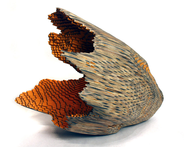Drenk’s most recent sculptures are a series called Implements, each of which begins with a mass of standard No. 2 pencils that have been tightly glued together. Using an electric sander she then molds the piece into a form that seems more likely to have originated in a dark cave or deep within the ocean than from a school desk. Of her work she says: