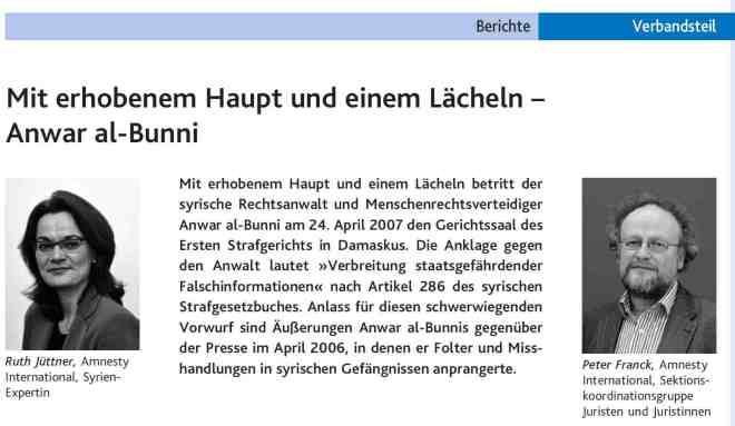 On Wednesday I blogged about the German Association of Judges awarding Anwar al-Bunni their prestigious human rights prize. On that page is a link to an article by Peter Franck und Ruth Jüttner of Amnesty International Berlin. My German is just about passable enough for me to be able to recognise that their words merited a fuller, more accurate translation. Thankfully, as a professional linguist, Dad’s German is better than mine…