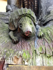 For me, “The Woodsman” isn’t just a quirky carving. Wood is a unique medium to work with. Unlike sculpting in bronze, from a cast, every single wooden carving, even if it appears the same, is very different. Each piece of wood has a different grain. Each piece of wood will have different knots to tax the skills of the carver. Hewn from local timber, from a tree felled in the Great Storm of 1987, “The Woodsman” is a unique piece of art designed to provoke thought and comment in the centre of a busy urban environment. In its original position, it broke up the concrete lines of the town and prompted a pause for thought, even if only a few seconds, to reflect on something that somehow managed to be both incongruous and perfectly situated at the same time.