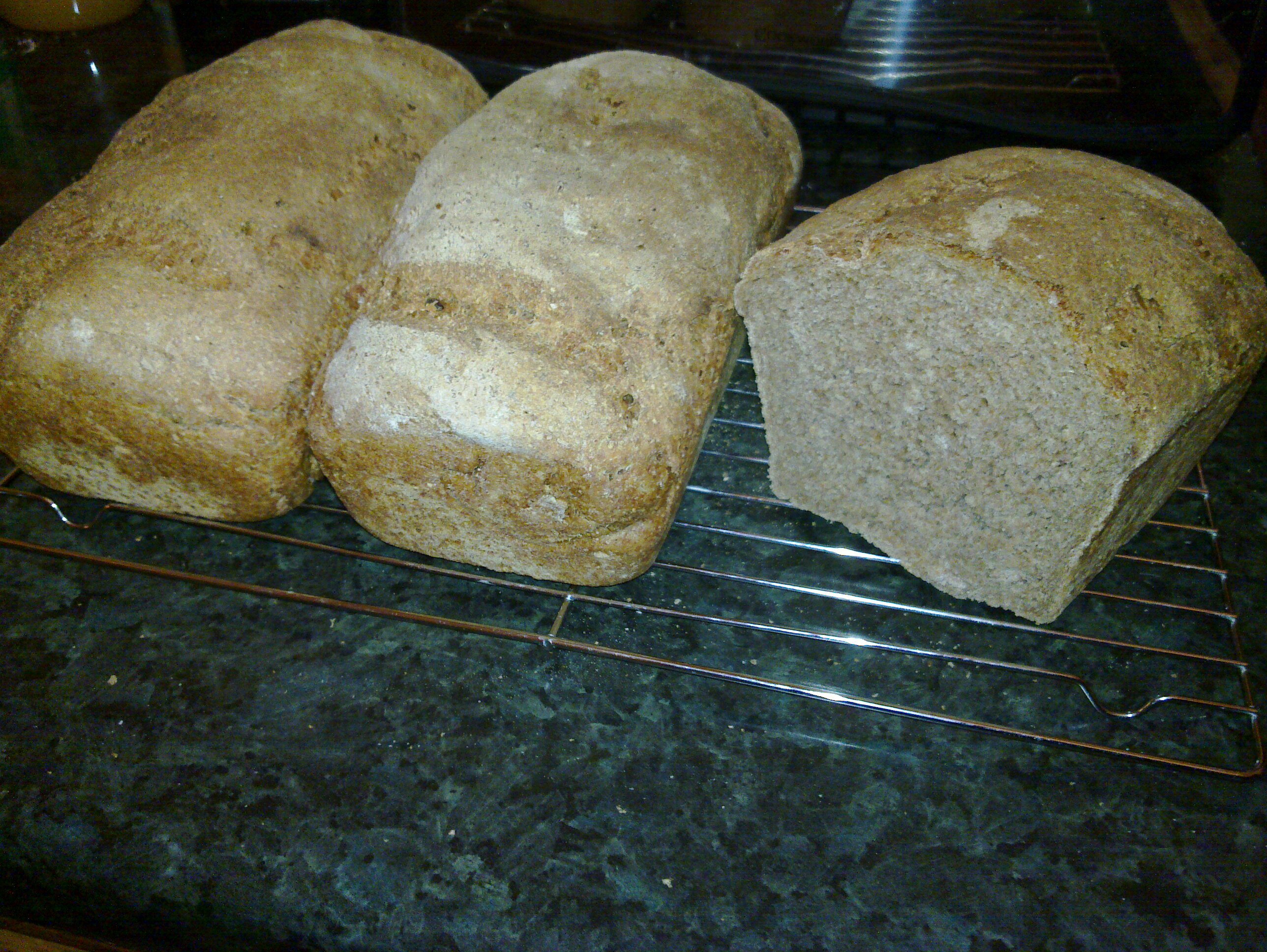 Be warned that if you use rye, your rises will be very different. Rye rises more slowly, even in a fifty-fifty mix, and doesn’t rise as far. Today was my first go with rye (I’ve baked with wheat flours for twenty years) and it was a messy business. The dough is stickier and has a more granular consistency than a 100% wheat mix. I let it rise for sixteen hours and it barely doubled in size (it developed a semi-hard crust in that time that got crushed back into the dough on the pummelling for the second rise). I gave the dough around two and a half hours for the second rise and whacked the loaves in the oven at a smidgeon over 1cm above the tins. Cooking time was the same 35 mins.